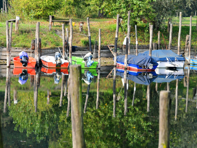 Vi si trova una tettoia con tavolini e un’area con attrezzi ginnici, mentre le colorate barchette ormeggiate ai pali lungo la riva danno un acceso tocco di colore.