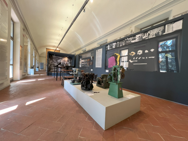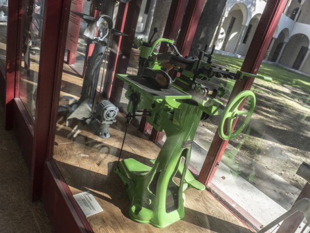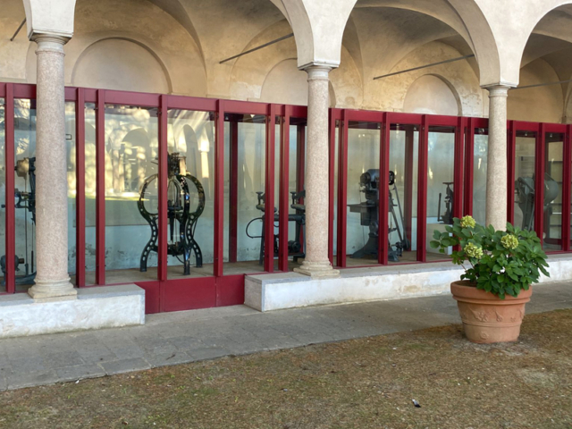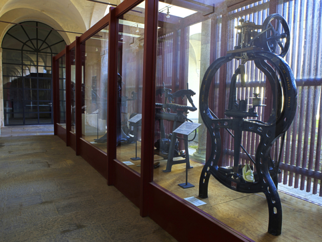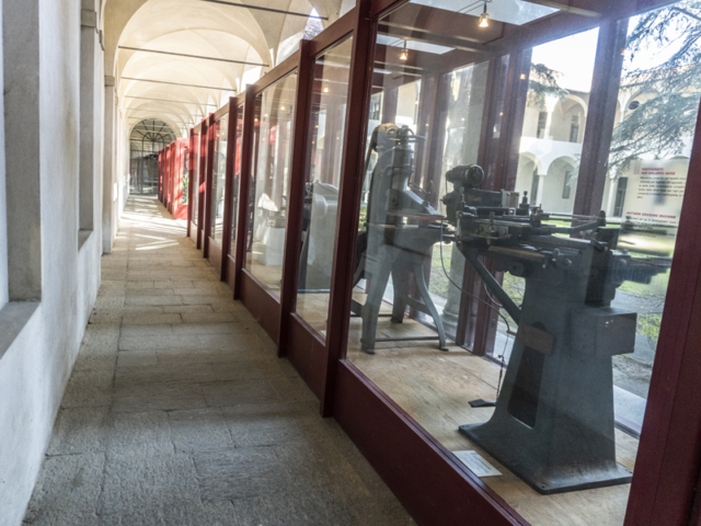 - La sezione d’ingresso, situata nello spazio porticato del chiostro, è costituita da teche vetrate in cui sono esposte macchine selezionate tra quelle che hanno segnato significativi progressi dell’industria calzaturiera. Nell’atrio d’ingresso alla scala che collega il primo piano, una carta storica identifica il fiume Ticino come confine naturale tra il territorio Lomellino e quello Milanese. Un video introduttivo illustra le finalità ed i contenuti dell’esposizione.