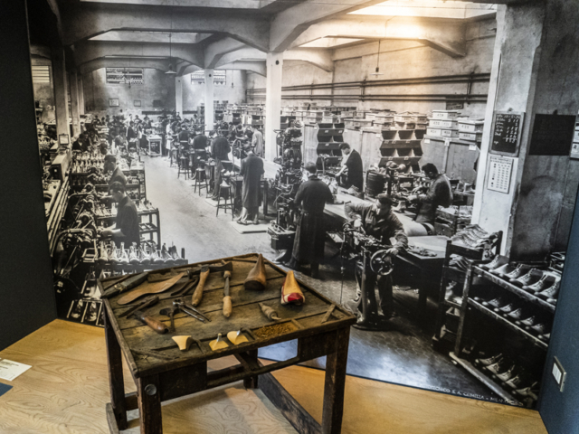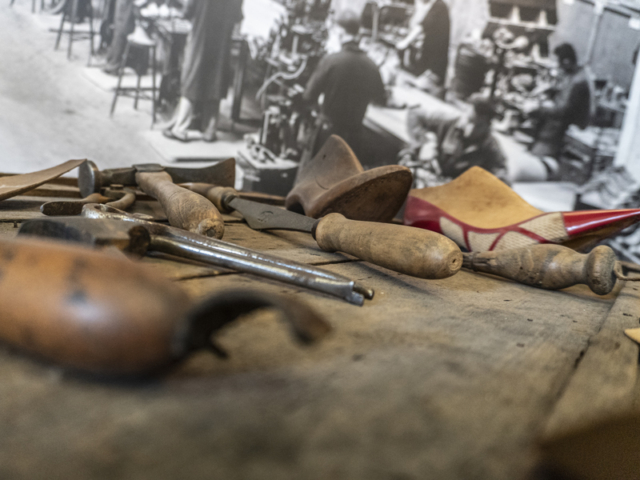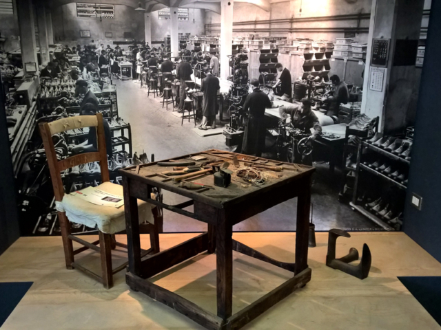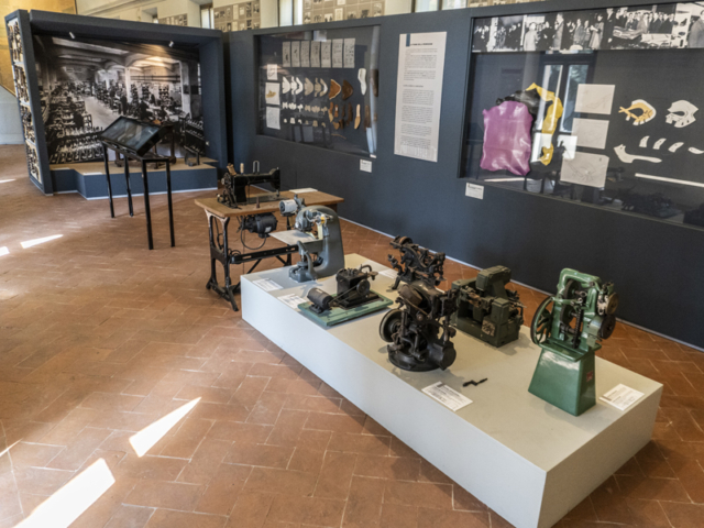 - La terza sala documenta la fase più specialistica dell’esperienza vigevanese, quella incentrata sui settori calzaturiero e meccanico, che hanno originato un distretto industriale di grande importanza nei più recenti anni dello sviluppo dell’economia italiana. La specificità della produzione calzaturiera vigevanese, determina negli anni una presenza sempre più rilevante sui mercati mondiali. La Città cresce e si trasforma rapidamente con lo sviluppo diffuso della piccola e media impresa. L’esposizione inizia con l’antico deschetto del ciabattino corredato di sedia e di tutti gli strumenti manuali di lavoro; prosegue con un’ampia rassegna di piccole macchine, di materiali, di manifesti e di immagini fotografiche, tutti rappresentativi del periodo di sviluppo imprenditoriale avvenuto nel secondo dopoguerra e che trova nella Mostra Internazionale della calzatura, accessori e macchine la sintesi più qualificata.